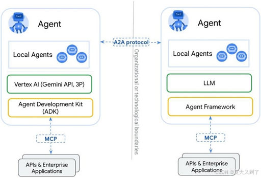 简单来说,A2A之于AI智能体,就像互联网协议之于计算机---它赋予智能体一种通用的网络语言。在框架A中构建的智能体A可以向在框架B中构建的智能体B发送消息或任务请求,智能体B将理解并做出适当的响应。它们不需要了解彼此"内部大脑"或代码的凌乱细节,这些均由A2A负责翻译和协调。