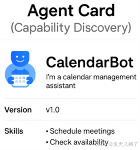 借助智能体卡片,其他智能体可以轻松发现和验证目标是否具备完成特定任务的能力。在智能体A向智能体B请求帮助之前,它可以先查看智能体B的卡片,确认智能体B是否拥有相关技能。这种方式避免了盲目调用带来的低效与错误。