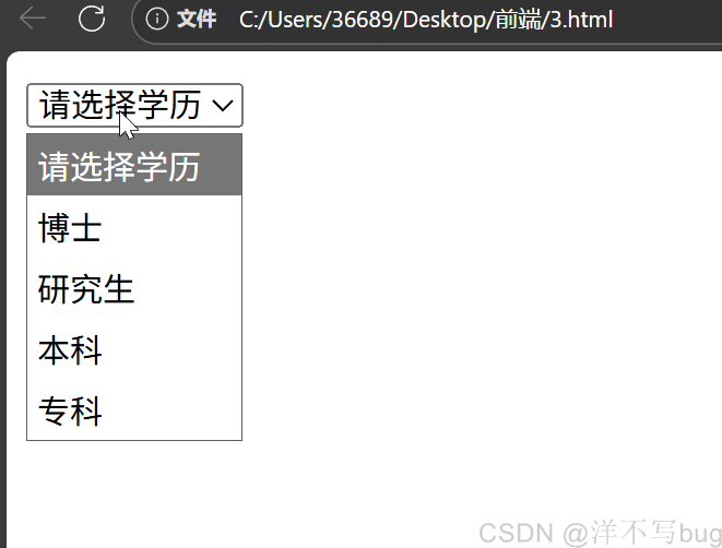 在公司入职时可能需要统计学历,往往就是以下拉表选择的形式,那就要使用到select标签