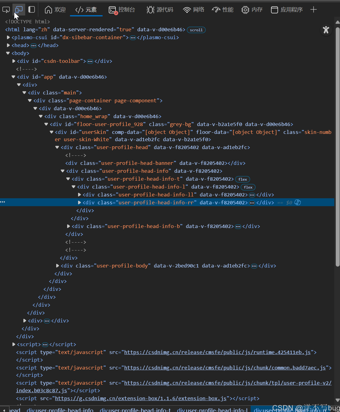 再写个div标签,还是检查看下,就会发现div每个独占一行,是大盒子