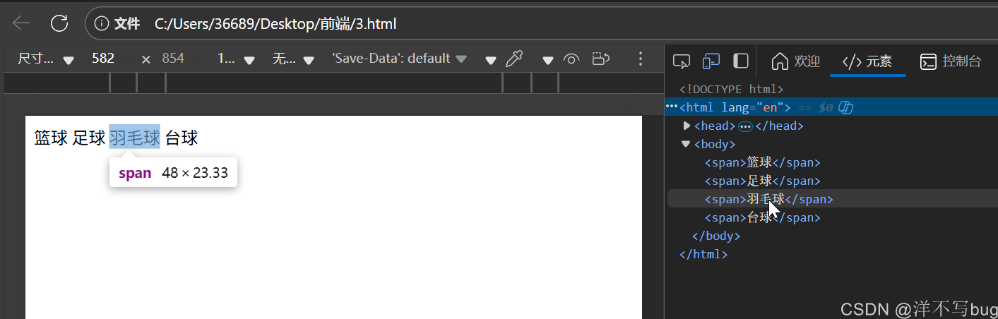 鼠标放在代码上,就会发现span标签是一个一个的小盒子,不独占一行markup<body> <span>篮球</span> <span>足球</span> <span>羽毛球</span> <span>台球</span> </body>
