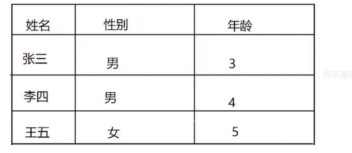在这个表中,上面姓名/性别/年龄这一行就是表格头部,下面的都是它们对应的数据,就是主体部分;