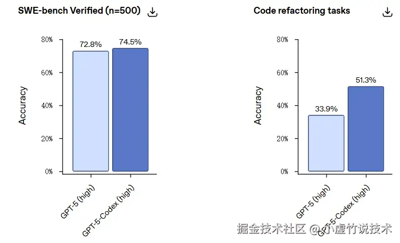 SWE-bench Verified(软件工程)和 Code refactoring tasks(代码重构)两个基准上的准确度表现都优于 GPT-5 (high)