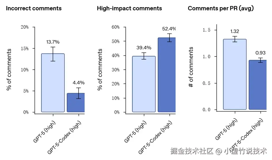 错误建议比例:GPT-5 的错误率是 13.7%,Codex 降到了 4.4%; 高价值建议比例:GPT-5 只有 39.4%,Codex 提升到了 52.4%; 平均每个 PR 留言数量:GPT-5 是 1.32 条,Codex 变成 0.93 条。少说废话,多讲重点。 这套测试成绩背后的意义是什么?