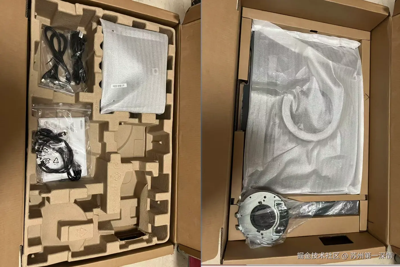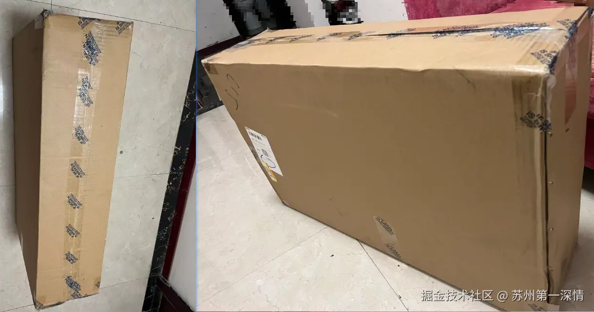 首先第一眼一看这包装就很厚实而且很大, 外面两层厚纸箱包裹着, 里面也有两层硬纸壳隔开屏幕和支撑架, 非常的安全。总重量大概20斤左右, 详情如下图所示: