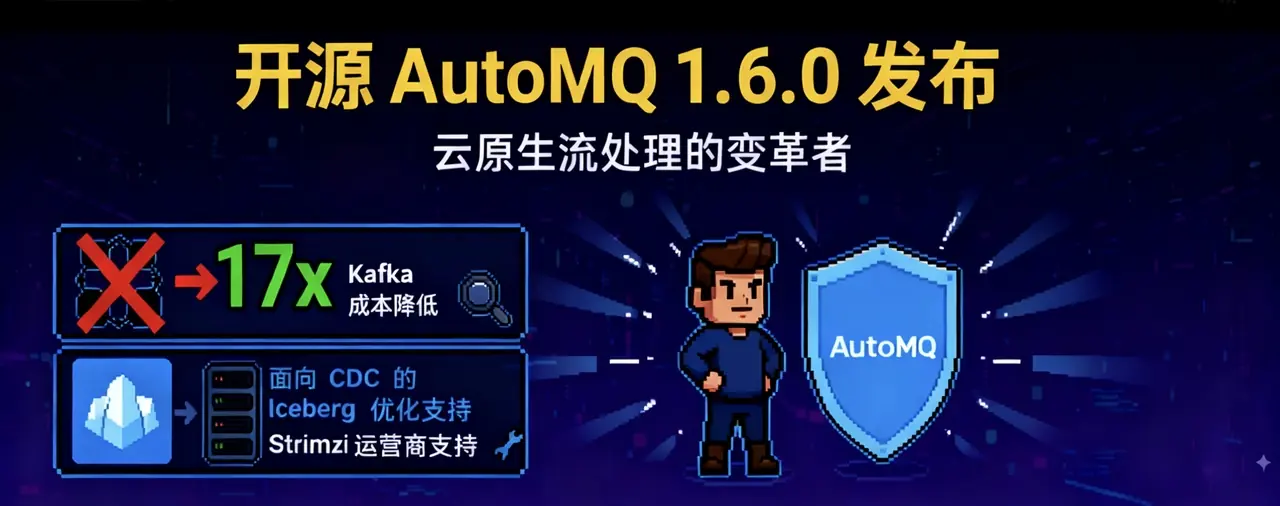 AutoMQ 1.6.0 版本带来了开发者在云环境中最关注的三大能力:成本大幅降低、数据湖写入简化、Kubernetes 上的无摩擦运维。基准测试显示其 TCO 较 Kafka 降低 17 倍,重构后的 Table Topic 实现 "零 ETL 写入 Iceberg",且通过 100% Kafka 兼容能力集成 Strimzi------ 这意味着你无需放弃现有工具与 API,就能充分享受云环境承诺的弹性优势。