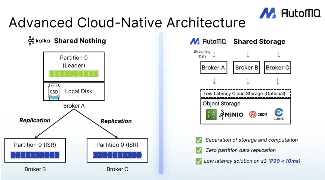 云原生数据持久性:单个可用区故障不再造成严重影响。将数据持久化任务转移到云存储后,数据的 "可信源" 始终安全,且无需承担管理多副本 ISR 机制的运维开销。