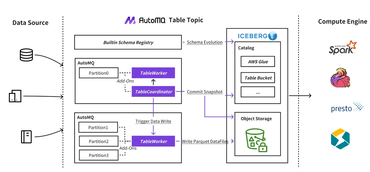 这种额外的负担被称为 "ETL 税",也是我们开发 AutoMQ Table Topic 的初衷。它并非又一个工具,而是对 "流数据到数据湖" 流程的根本性重构。Table Topic 是一种特殊的 Topic 类型,可作为 Kafka Broker 原生的零 ETL 桥梁,将数据无缝流式传输到 Apache Iceberg。其目标是通过简化操作、自动化 Schema 演进、提供端到端可靠性(无需依赖外部系统),彻底消除 "ETL 税"。