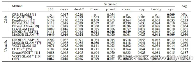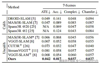 在TUM RGB-D、7-Scenes和Replica等标准数据集上,SLAM-Former在未标定设置下显著优于现有方法,甚至在许多场景下超越需要相机标定的传统方法。