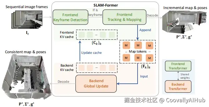 前端负责实时处理序列图像,进行关键帧检测、姿态估计与增量式地图更新;后端则以较低频率启动,对所有历史地图令牌进行全局优化,确保几何一致性。
