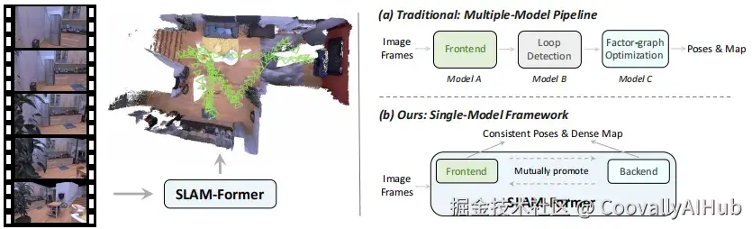 传统SLAM系统通常分为前端 (实时跟踪与局部建图)和后端(全局优化与回环检测),二者分离设计,虽成熟但存在误差累积与全局一致性难以保证的问题。