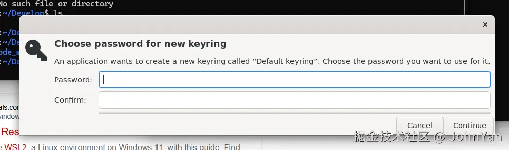 后续的代码和操作,就可以执行了。这也可能并不是Linux系统本身的问题,而是由于WSL2比较奇怪的操作系统执行方式所限制的。这里还是先要通过一个比较奇怪的对话框操作(其实就是输入keyring的密码):