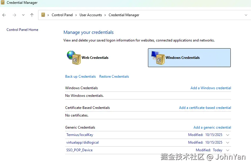 凭据存储于Windows凭据管理器;用户可以在控制面板 → 凭据管理器 → Windows 凭据板块中查看;凭据通过 CRED_PERSIST_ENTERPRISE标志实现持久化,并按用户范围隔离;使用Windows数据保护API进行加解密。