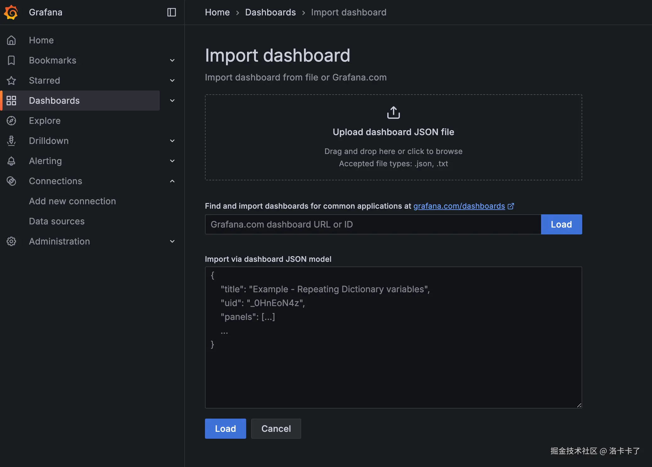 有了上面的 JSON 模板之后,我们就可以在 Grafana 里一键导入,直接生成我们自己的监控大盘。