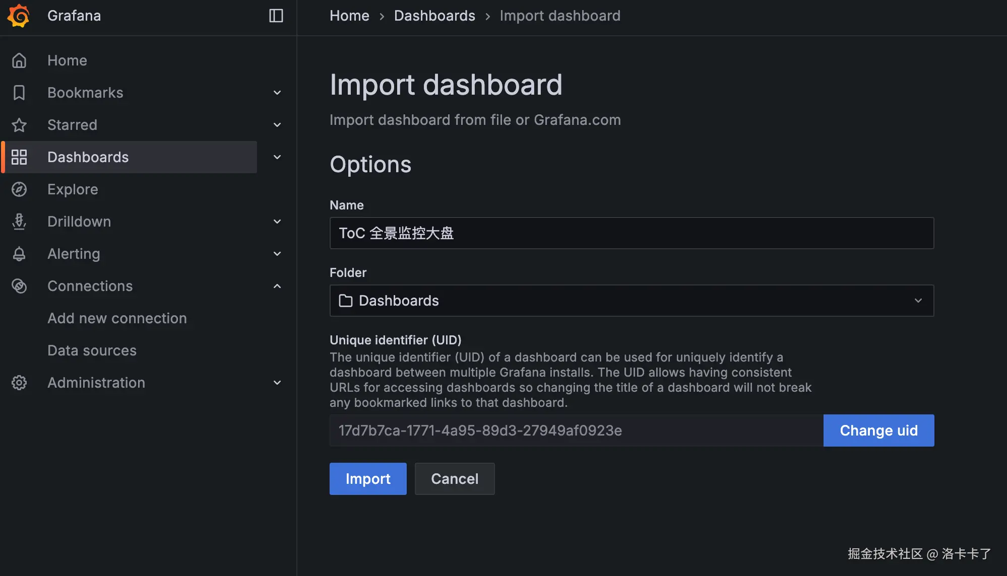 导入模板后,Grafana 会让我们选择一个数据源。这里选择我们之前配置好的 Prometheus 数据源(一般叫 Prometheus