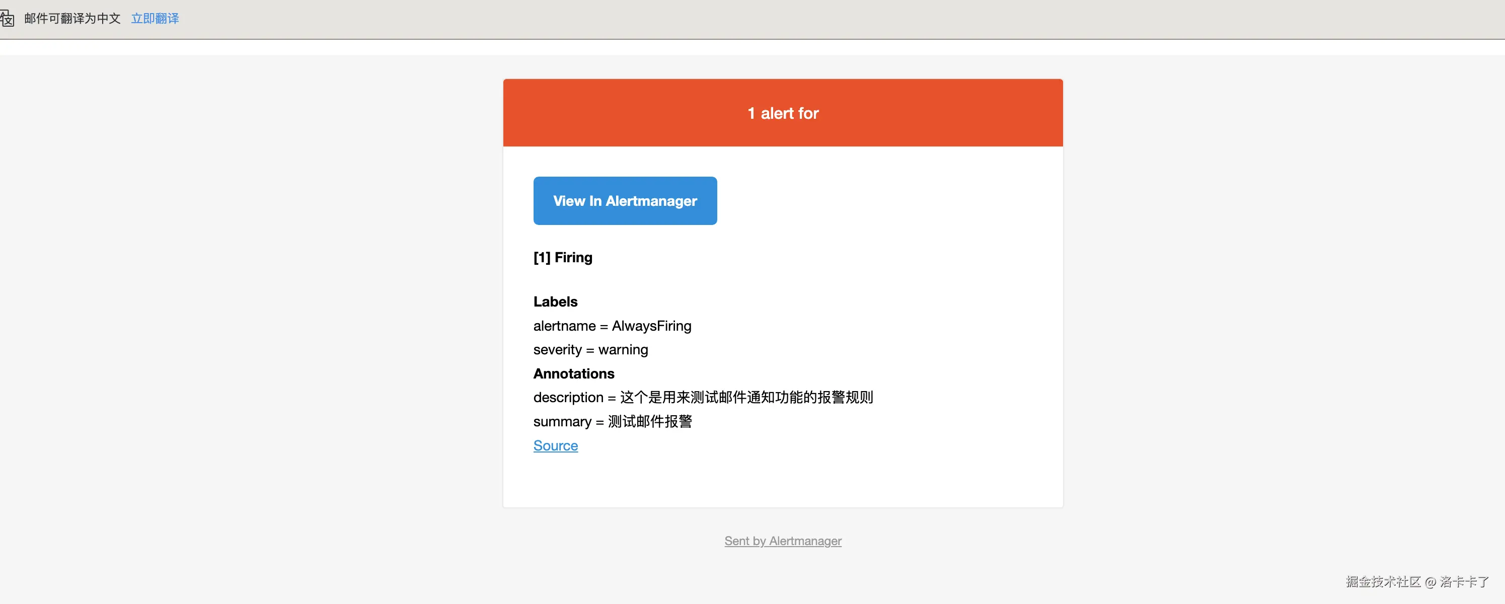 这一整套流程,从 Prometheus 采集监控指标 → 触发报警规则 → Alertmanager 发送通知 → 邮箱或 IM 工具接收告警消息,构成了一个闭环的告警链路。