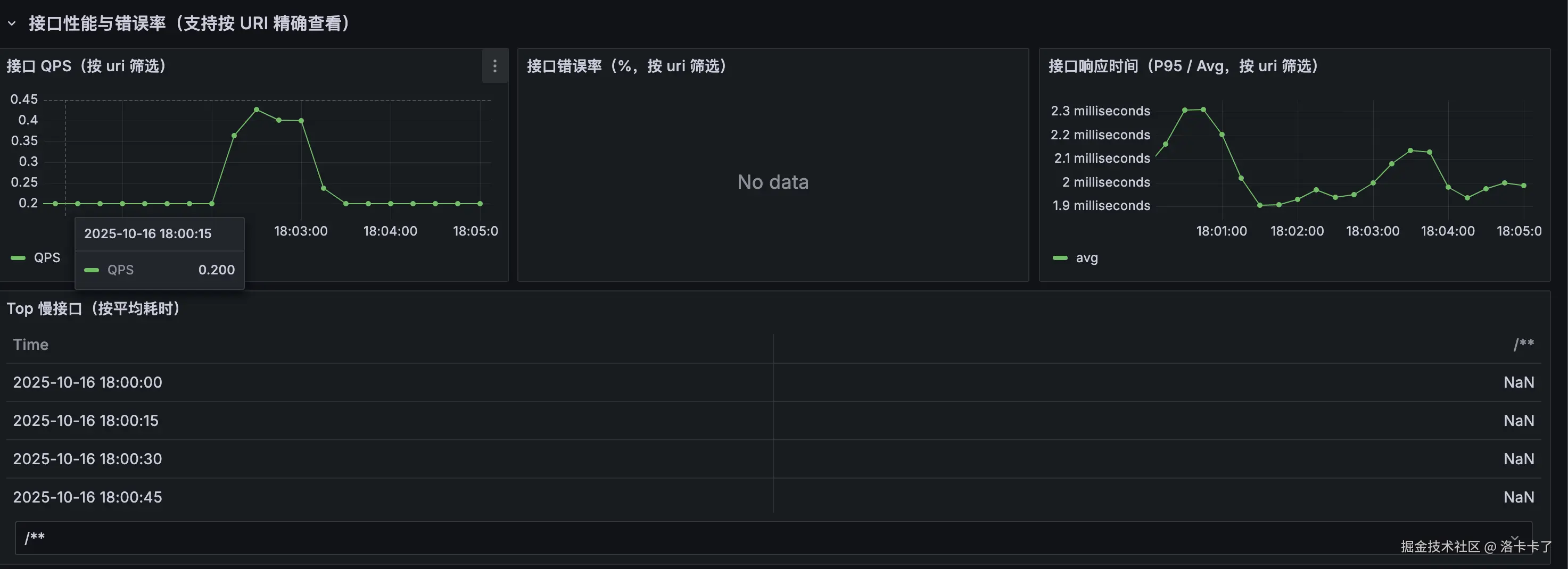 - 响应时间(P99 / 平均) :接口是不是变慢了,用户会不会卡住。
