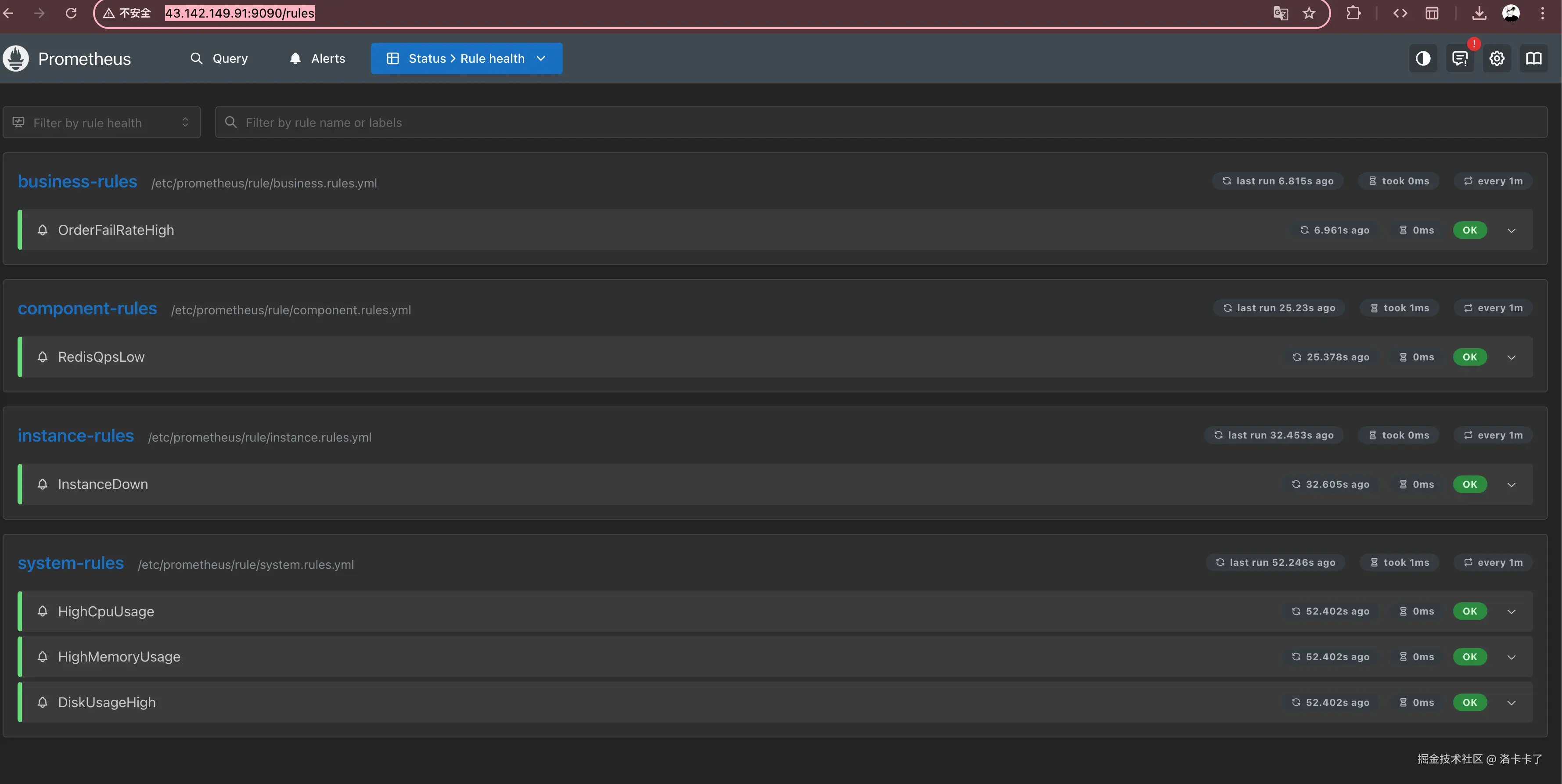 文件:系统类(比如 CPU、内存、磁盘)、组件类(比如 Redis、MySQL)、业务类(比如下单失败率)、实例类(服务是否存活),并结合实际写了 PromQL 表达式,搭出了一套清晰、可维护、结构分明的报警规则体系。