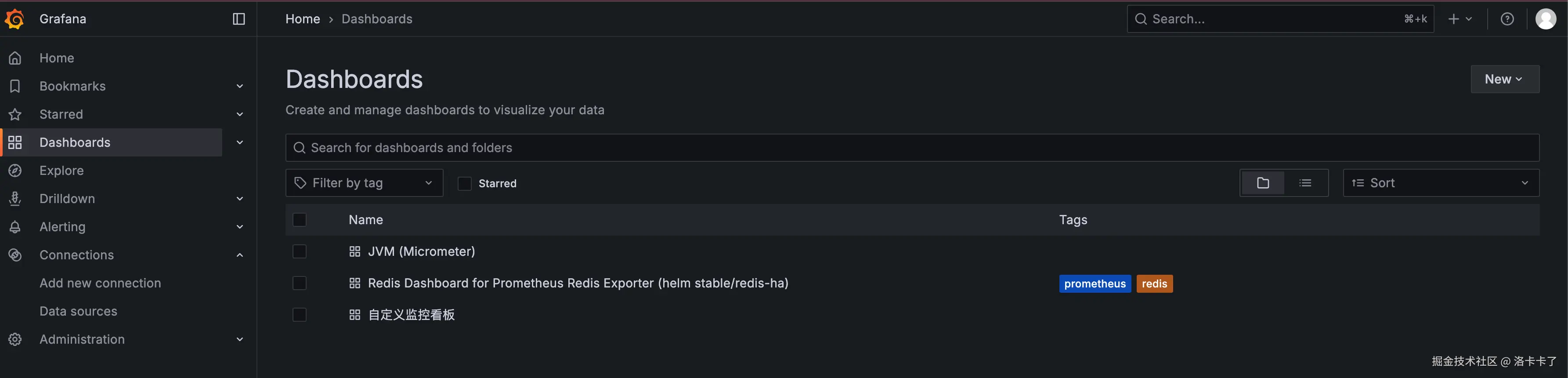 打开我们的 Grafana 后台,点击左侧菜单栏的 Dashboards,如下图: