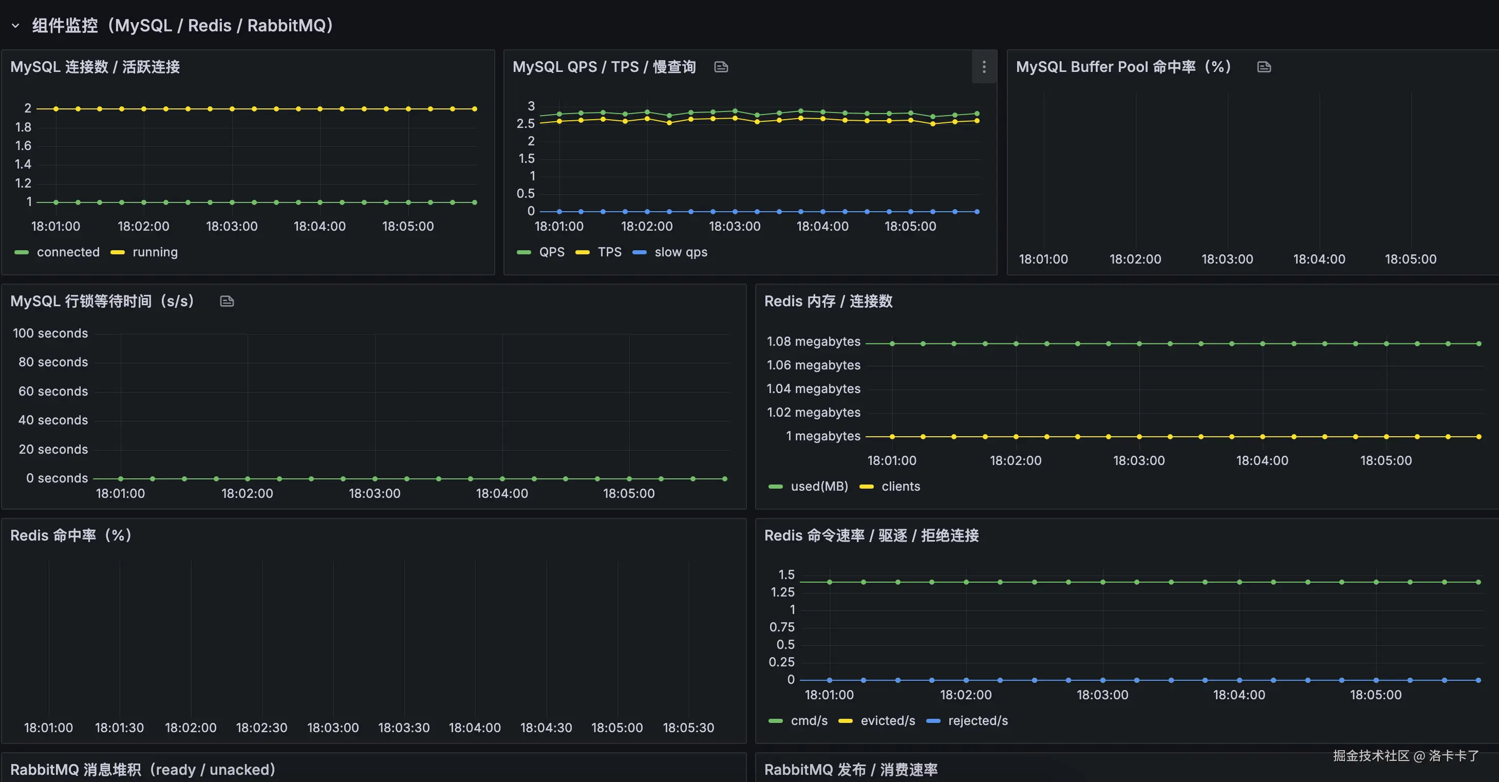 像 Redis、MySQL、RabbitMQ 这些"底层中坚力量",一出问题就牵一发动全身,也建议单独关注它们的运行情况,比如: