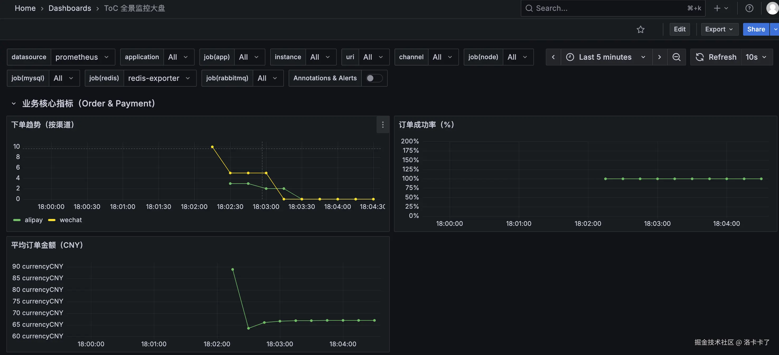 在上一篇文章中,我们已经实现了 Prometheus 的业务指标埋点,比如订单数、支付成功率等。