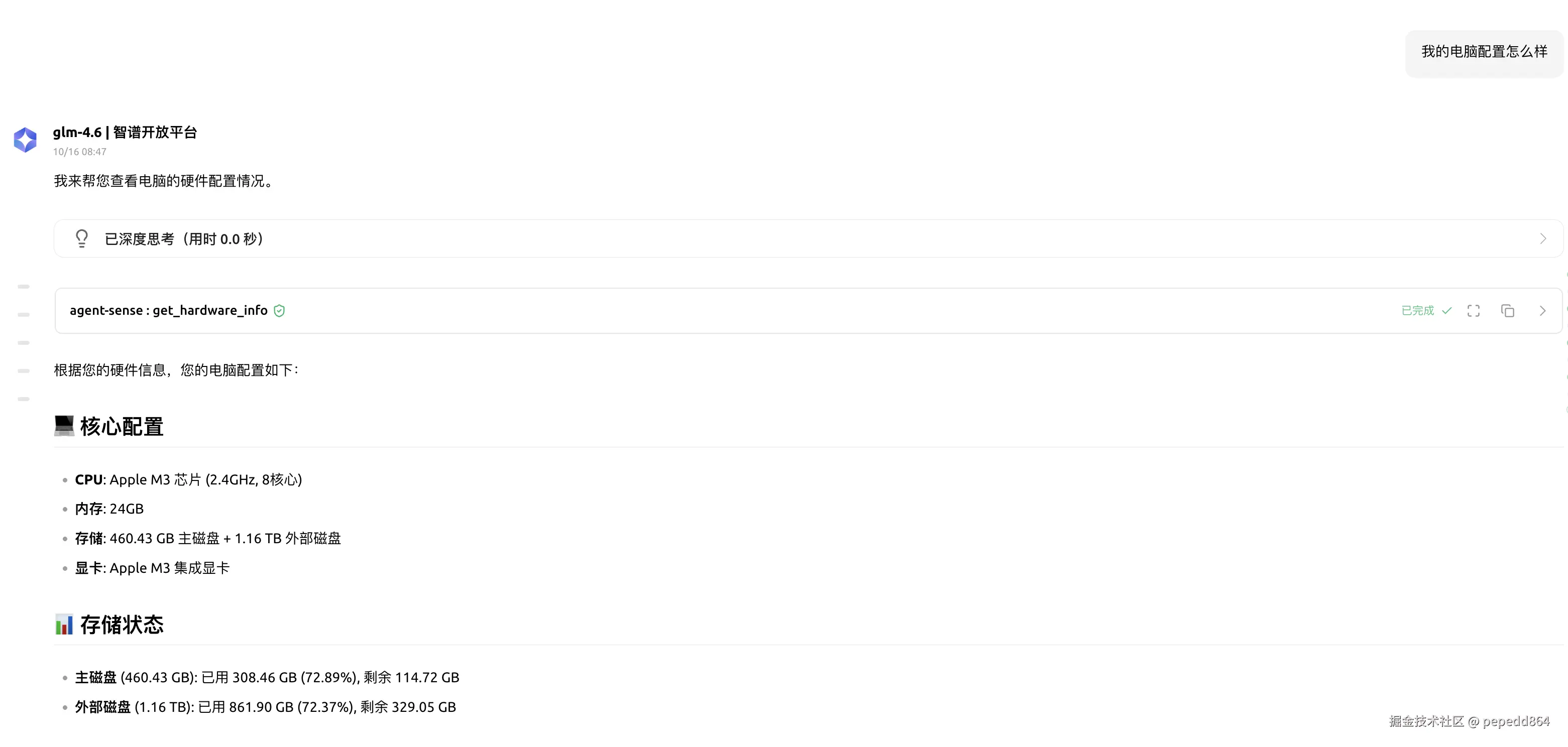 用户 : "我的电脑运行很慢,怎么回事?" AI : 调用硬件信息获取功能 → 发现内存使用率99.72% AI回复: "你的内存使用率已达99.72%(23.93GB/24GB),建议关闭一些应用程序释放内存。"
