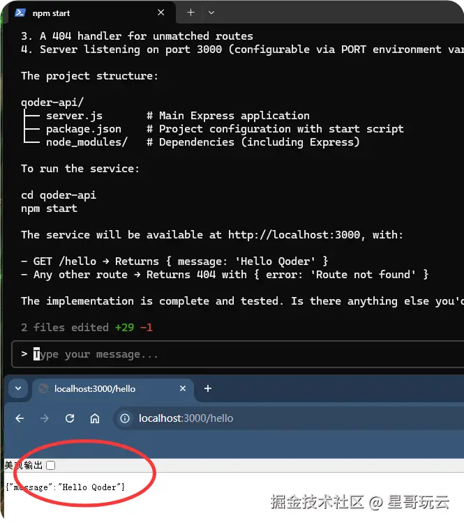 qodercli "生成一个使用 Express 的 Node.js API 服务,包含一个 GET /hello 路由,返回 JSON { message: 'Hello Qoder' }"