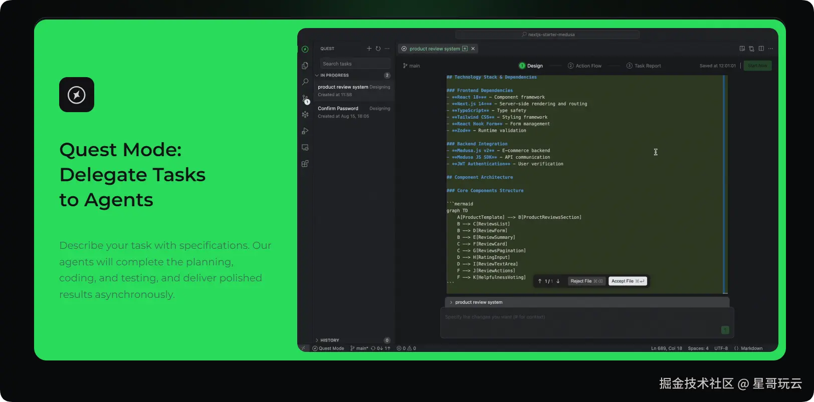 - • 快速原型开发 借助 Qoder CLI 的 Quest 模式,你只需描述需求,AI 就能自动生成技术规范并拆解为可执行步骤,适合快速搭建原型或验证想法。