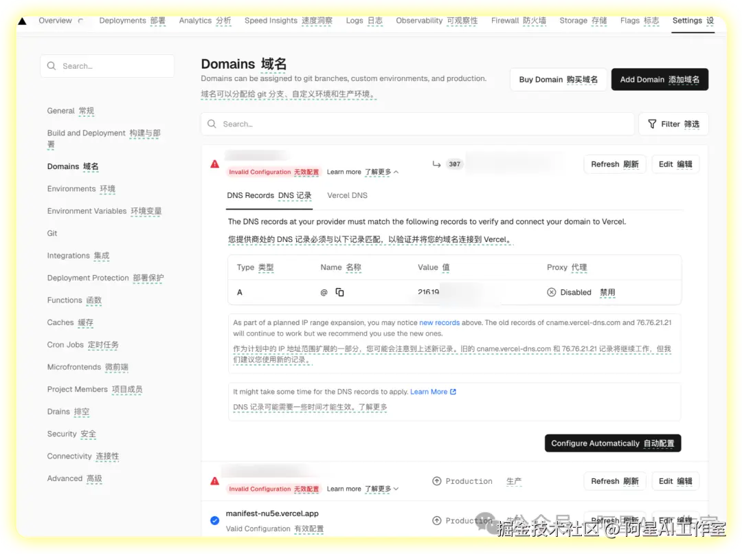 返回vercel的domain域名设置界面