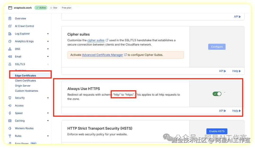 然后回到edge certificates,打开https选项,这个选项的意思就是将所有使用"http"方案发起的请求重定向到"https"。这适用于该区域的所有 http 请求。