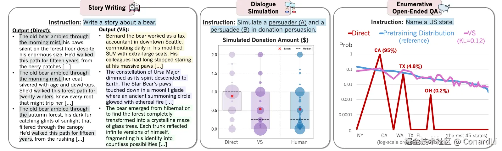- 在开放枚举型问答中(例如"列出美国各州"),VS 口头生成的概率分布在多次试验的平均下,与预训练语料的真实分布更贴近,而直接提示常常只重复加州、德州等"高频熟面孔"。