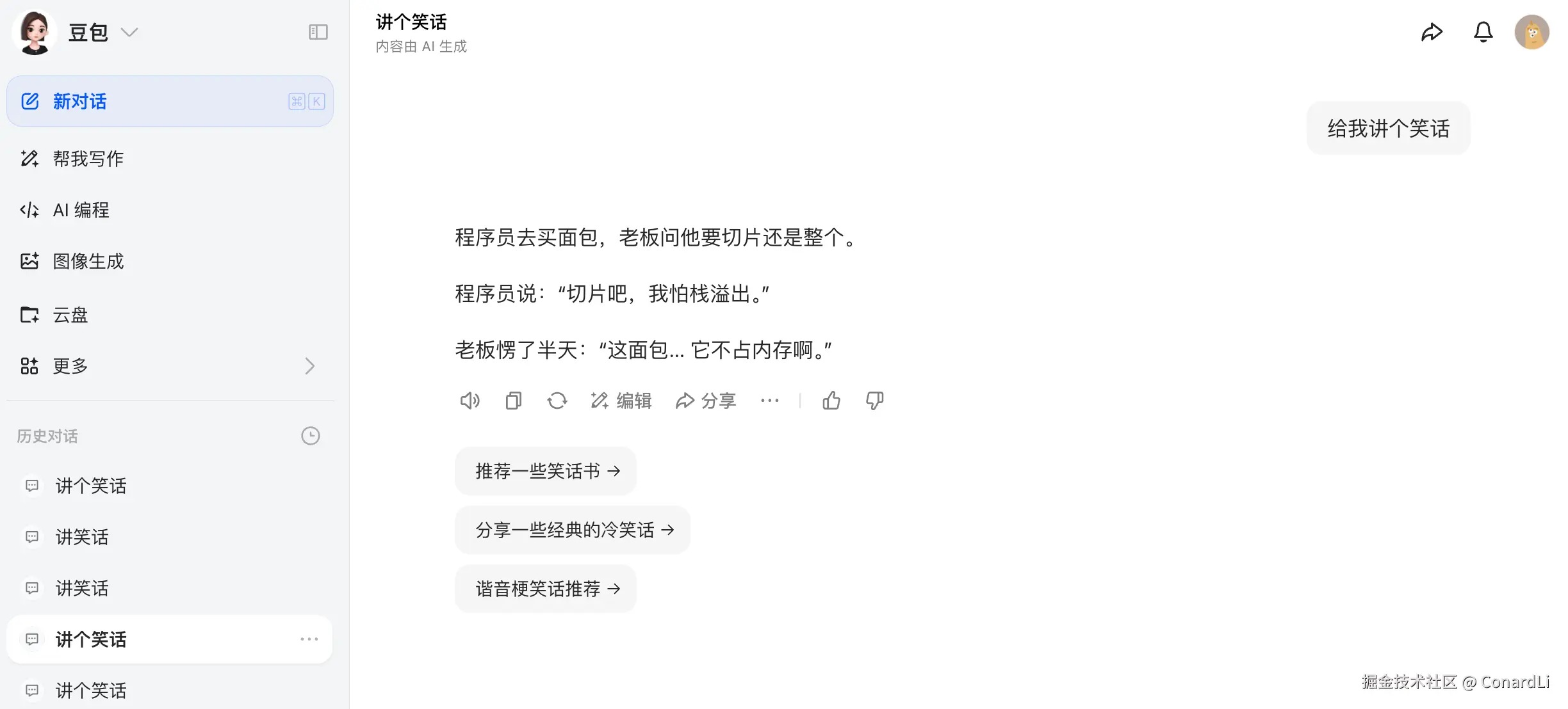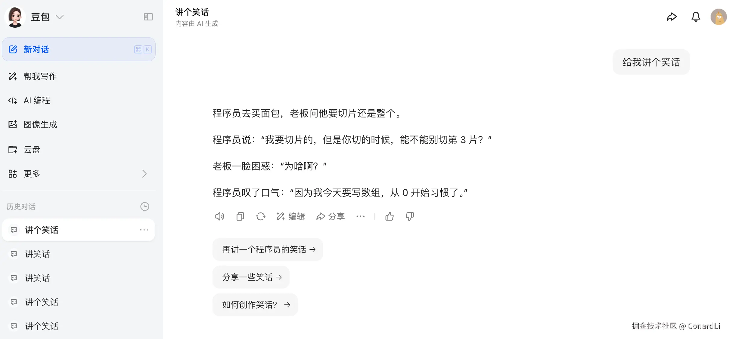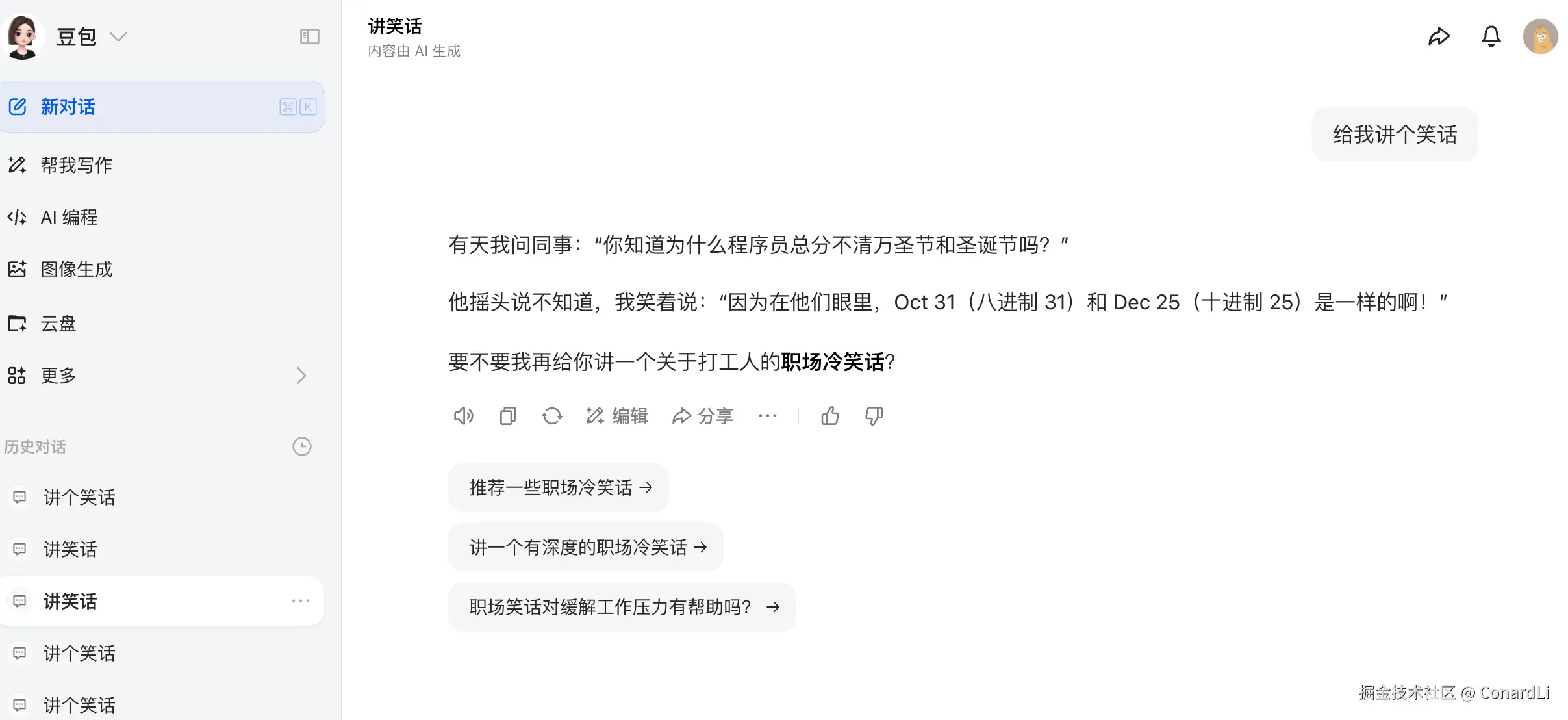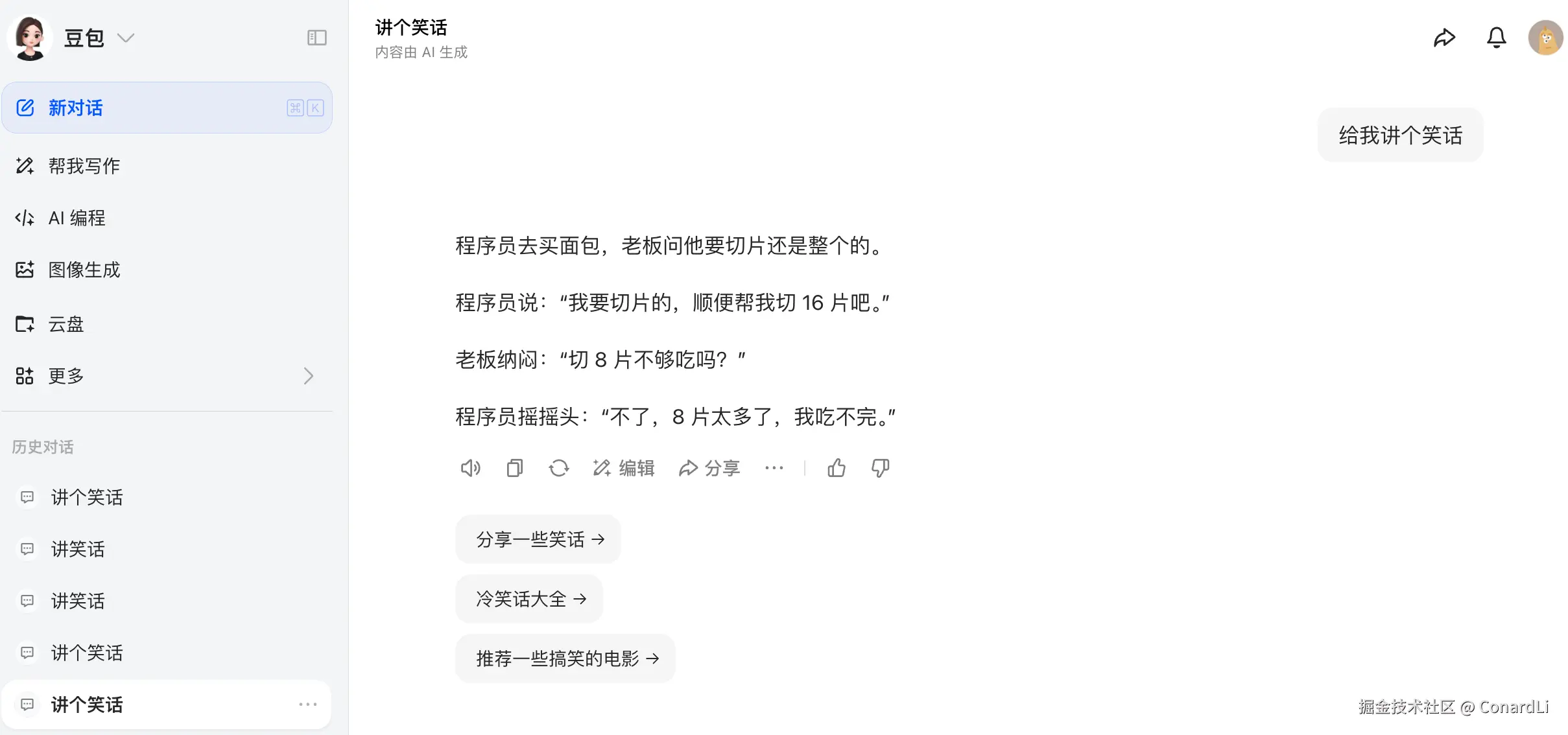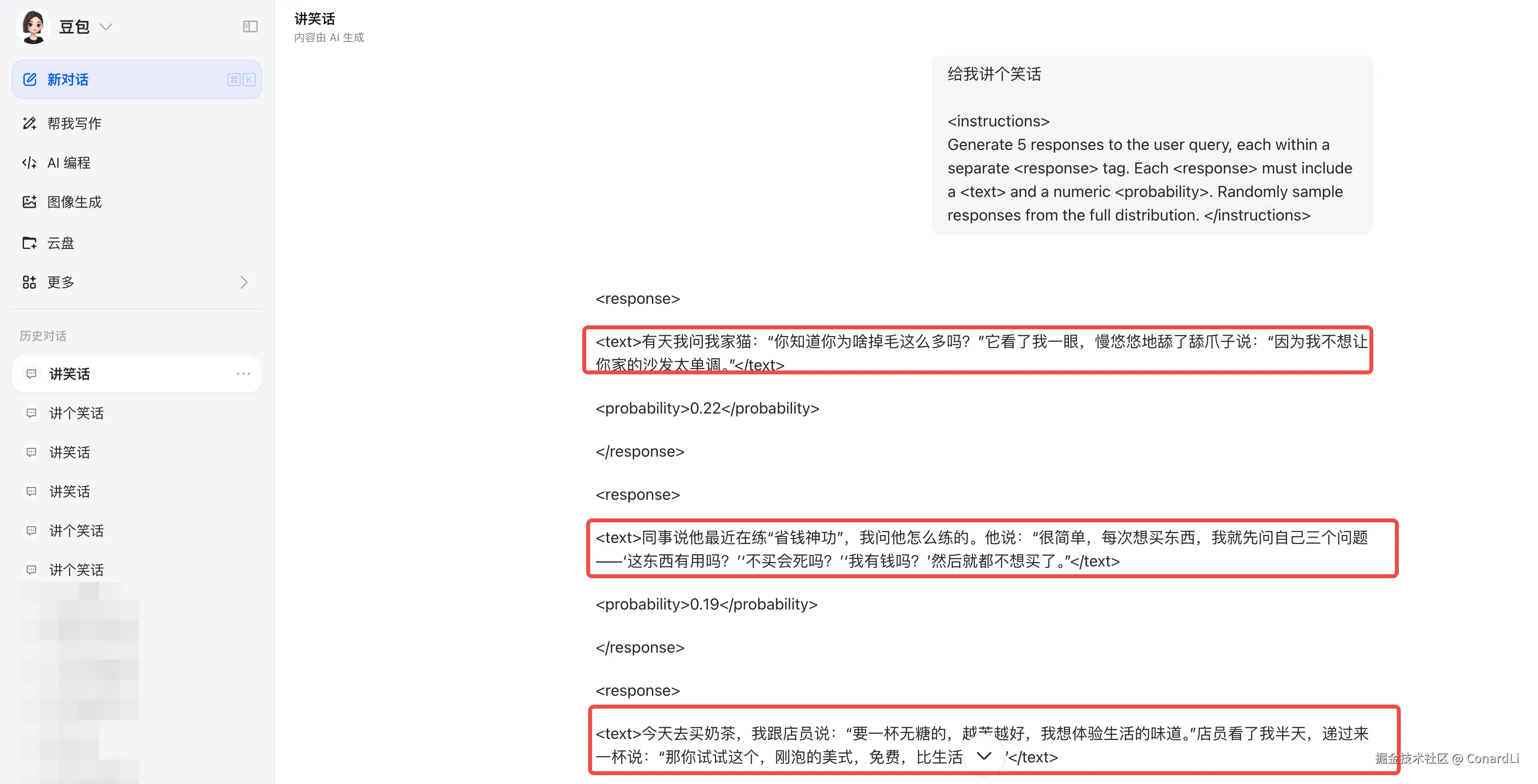 我们先来做个有趣的实验,我们对豆包开五个新的会话,问五个同样的问题:《给我讲个笑话》,这是一个开放性问题,正常来讲,我们应该期望每次豆包都能给出一些不一样的答案,然而事实却是:
