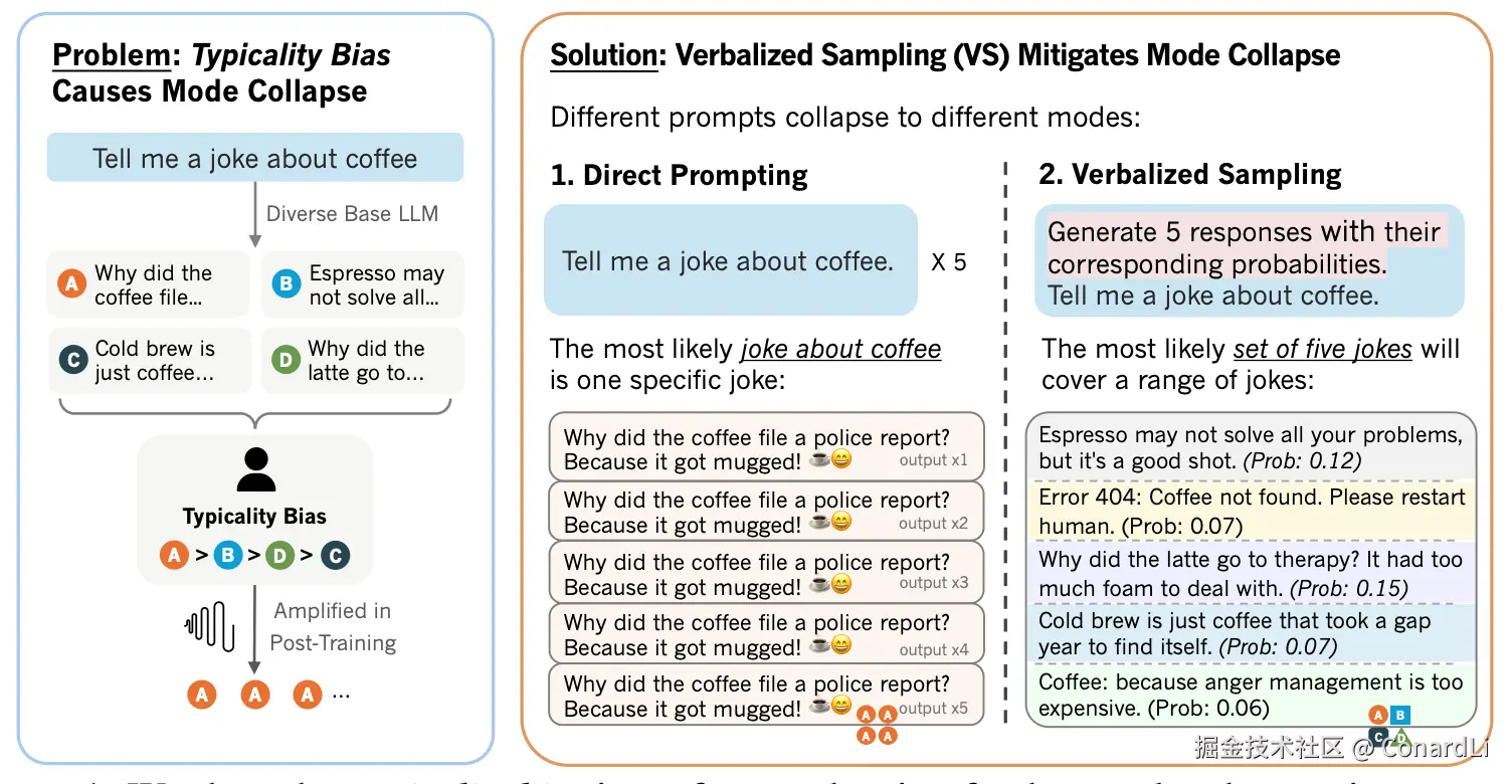 (简称 VS)》:不要只让模型给一个答案,而是让它先 "口头说出" 一组可能答案及其对应的概率,再基于这套概率分布进行采样与选择。这样做能显著缓解对齐训练带来的 "模式坍缩"