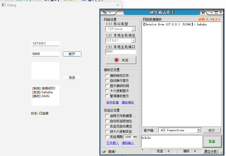 ),确保该端口未被其他程序占用。 - 启动服务器:点击"启动"或"监听"按钮,调试助手进入监听状态,等待客户端连接。
