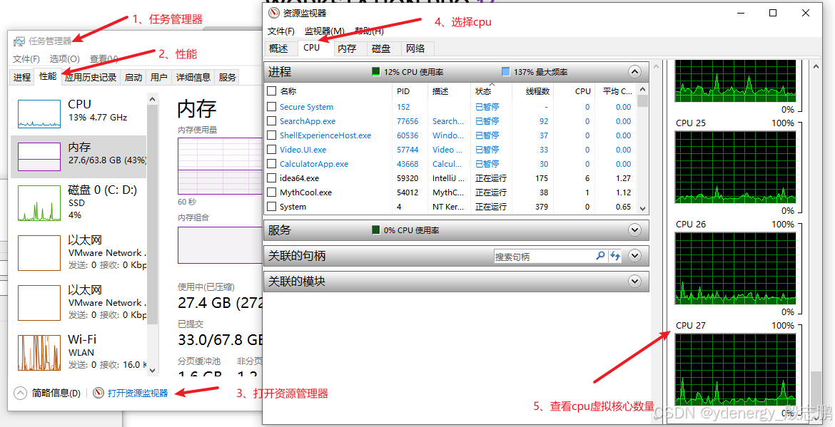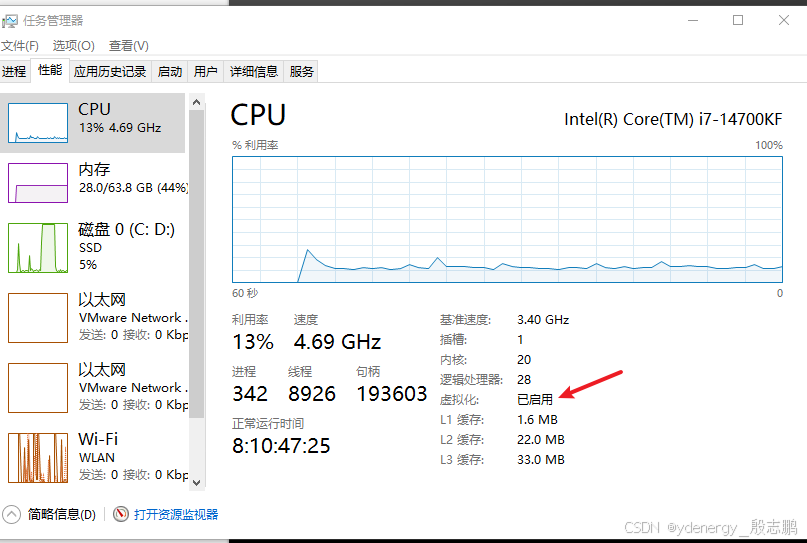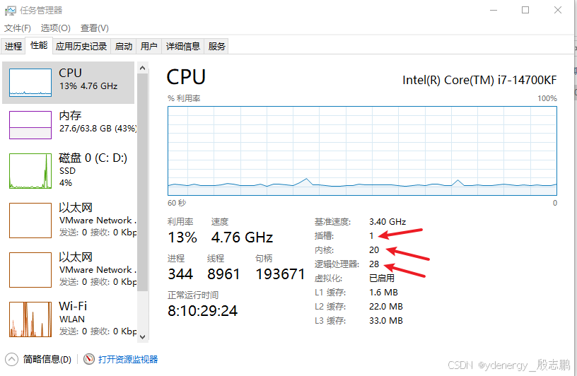 给虚拟机分配cpu资源,先要搞清楚我们cpu有多少个逻辑处理器和内核数量,其中插槽代表我们CPU处理器的数量