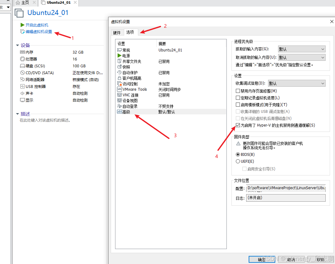 编辑虚拟机设置-选项-高级-为启用了Hyper-V的主机禁用侧通道缓解,勾选上