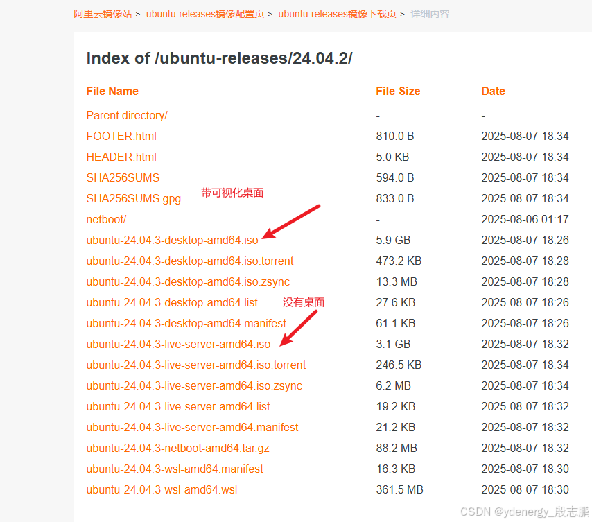 然后下载iso镜像即可,我这里选择带桌面,有图形界面的版本ubuntu-24.04.3-desktop-amd64.iso