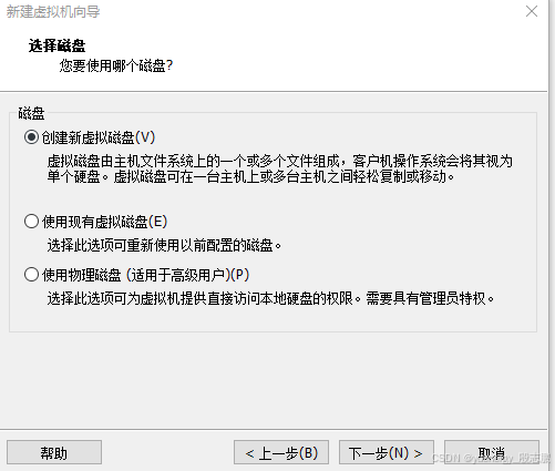 给虚拟机分配磁盘,我这里选择创建新的虚拟磁盘(说明:分配大小不是直接从你电脑拿出一块空间,是可以配置的,我们可以选择最大容量,也就是你虚拟机使用过程中用多少,实际就用多少,上限为你设置的值。当然也可以选择直接分配这么多空间,效率更高。)