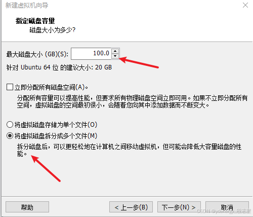 选择立即分配磁盘空间,会直接将分配空间容量使用,而选择拆分多个文件,会动态分配空间,初始很小,数据越多,它越大。