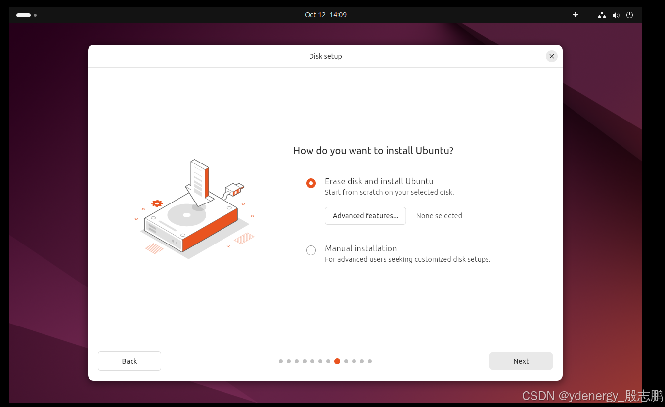 选择擦除当前磁盘所有内容进行安装Ubuntu系统,如果你不想删除现有磁盘内容,就选第二个选项
