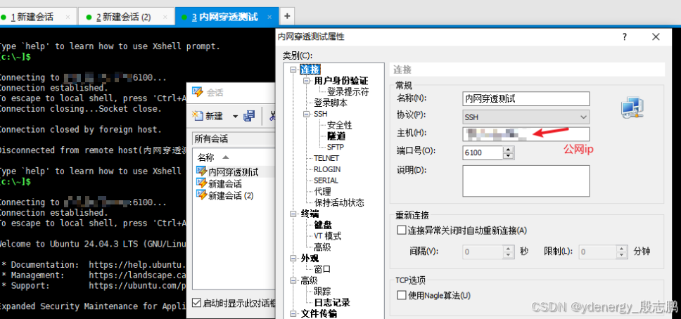 首先我们xshell访问虚拟机需要22端口,所以我们内网穿透需要配置22号端口,这里我将22号端口映射到云服务器的6100端口,此时就可以通过公网ip的6100端口穿透到虚拟机22号端口