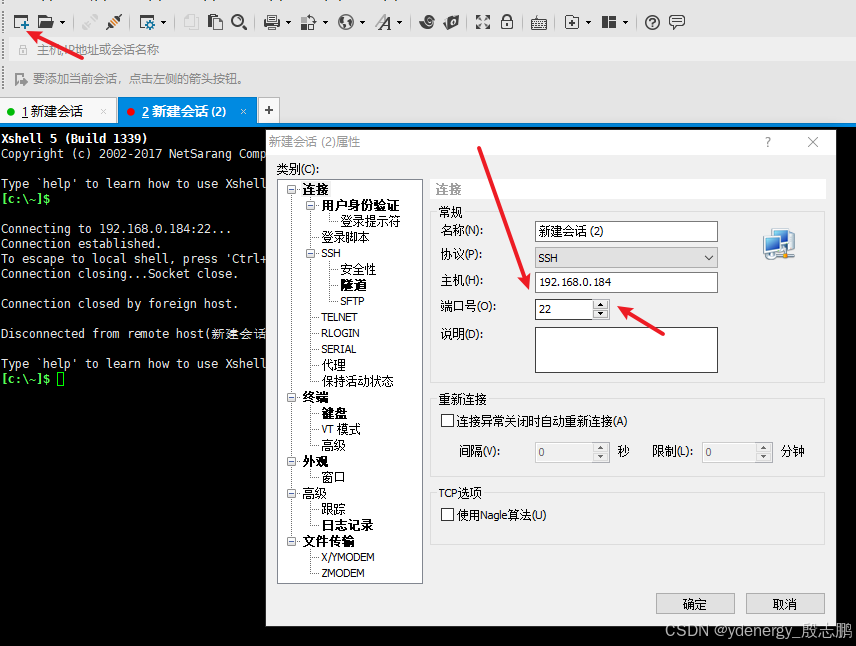 此时进入xshell,新建一个连接,主机输入我们上面的ip地址,端口号22