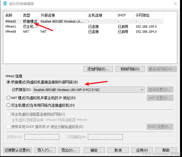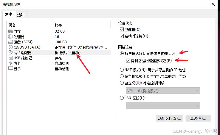 确保我们目标虚拟机网络适配器配置,勾选了桥接模式和复制物理网络连接状态