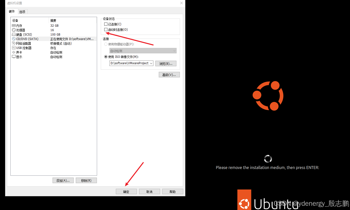 安装成功后,需要重启系统,此时我们已经将iso文件安装到物理磁盘了,所有需要改一下虚拟机设置。