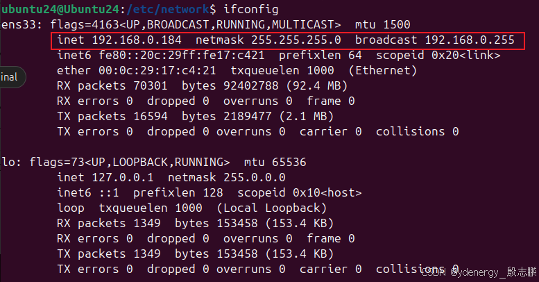 使用命令ifconfig查看ip地址inet,我这里是192.168.0.184