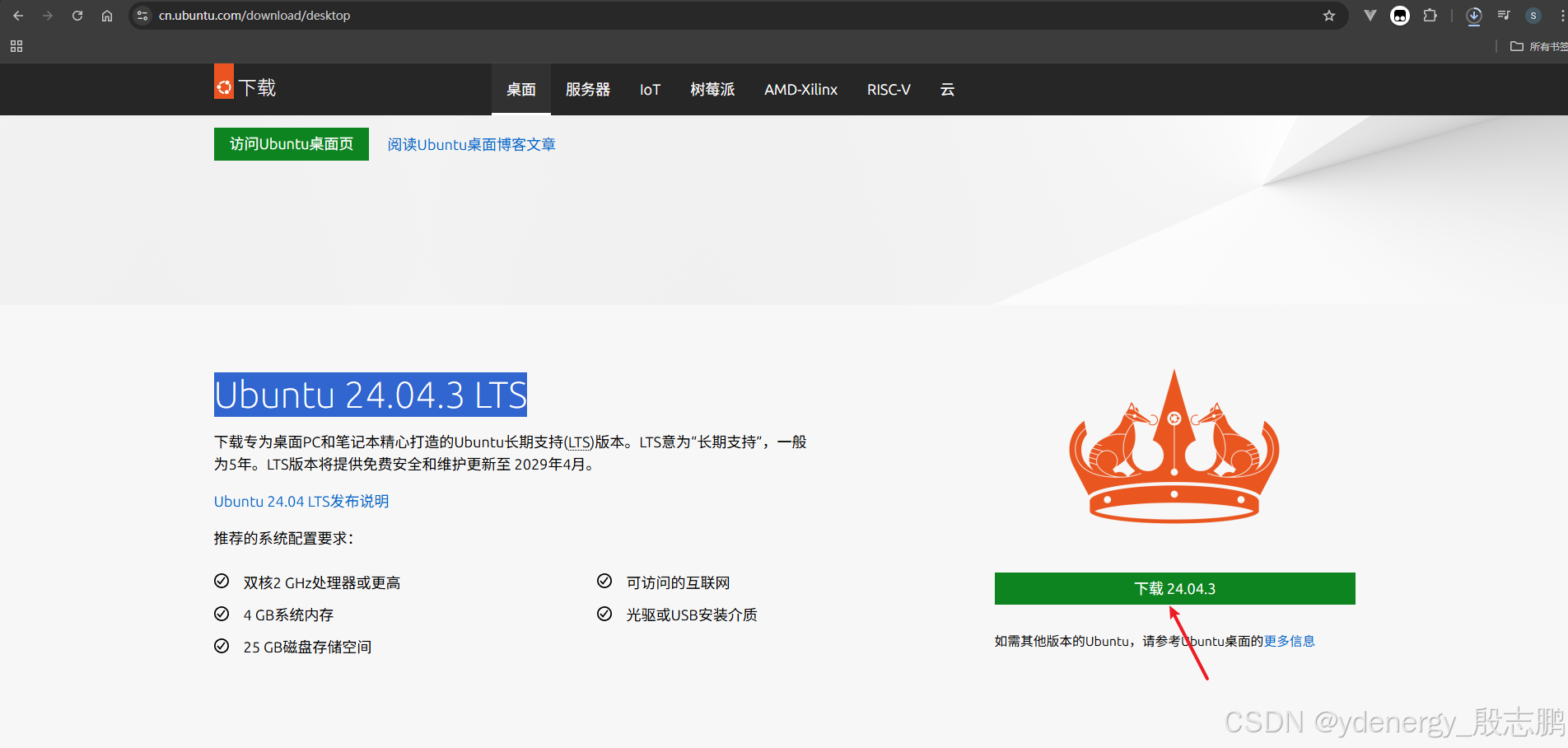 有了虚拟机,我们就需要系统镜像了,Ubuntu 24.04.3 LTS 桌面版(有可视化界面)官方下载:https://cn.ubuntu.com/download/desktop