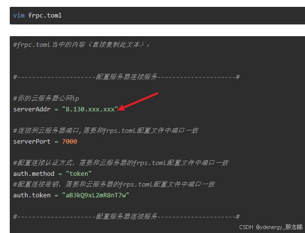 4、编辑frpc.toml文件,大家根据下面的代码片,自行配置即可