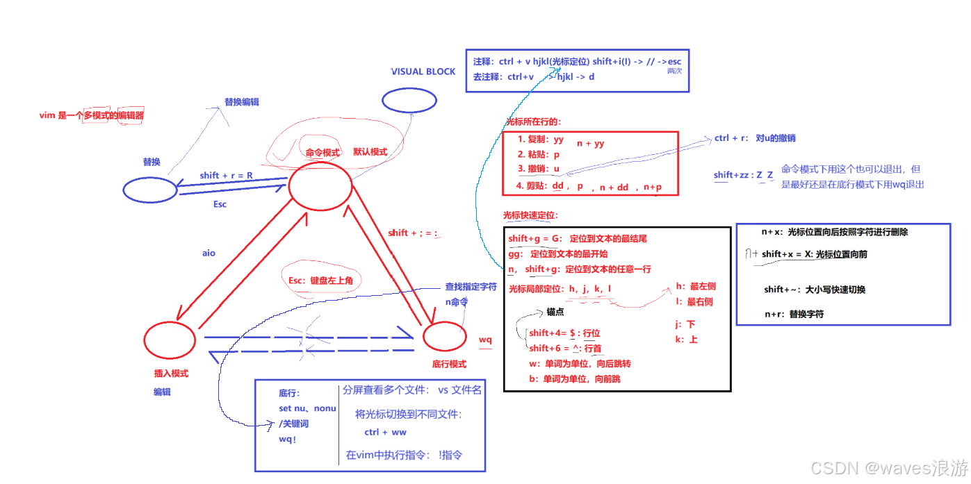 vim 有很多种模式,要查看所有模式:打开 vim,底行模式直接输入 help vim-modes