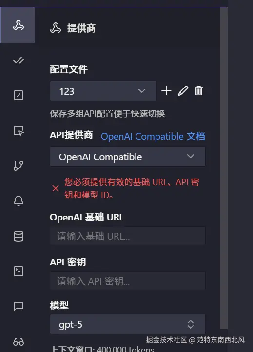 API提供商选择 openai compatible 基础URL 输入 agentrouter.org/v1 api密钥 输入刚刚你复制的内容 模型选择 gpt-5 点击保存