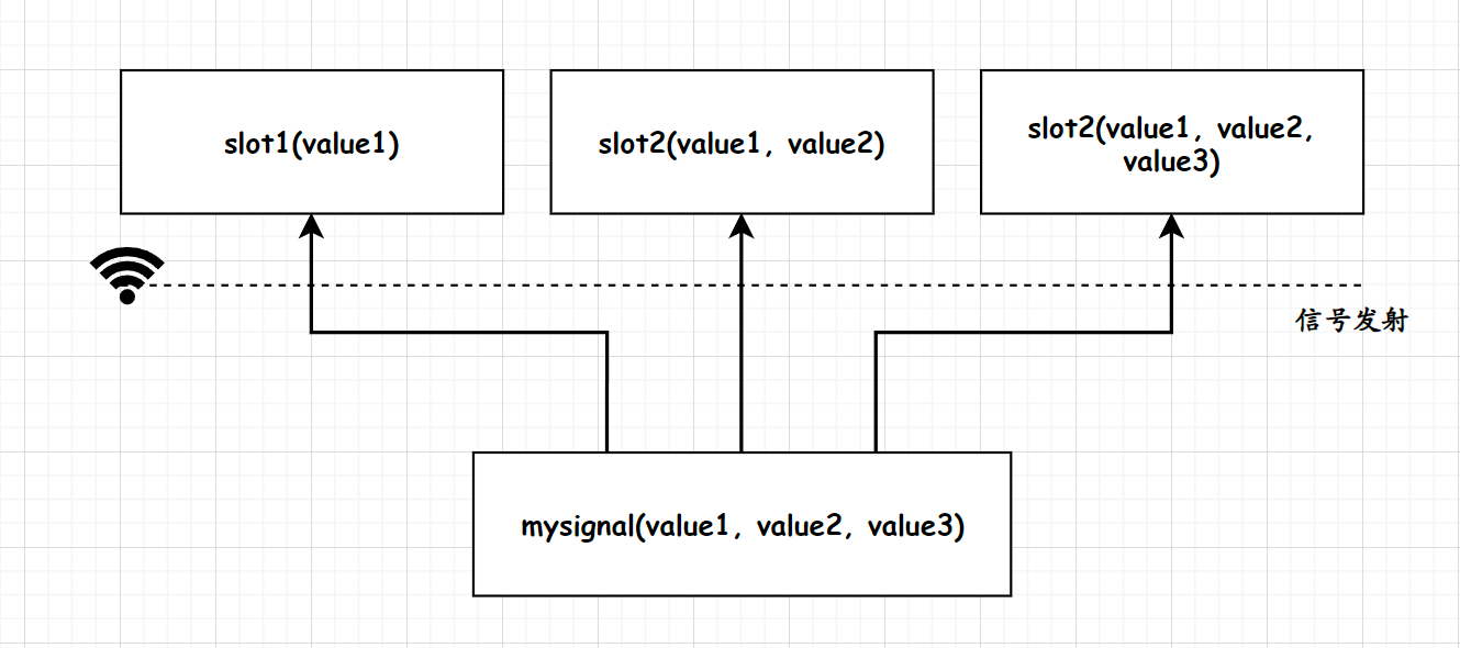 该例子只举例了信号/槽之间参数的差异, 并未举例出多对多的特点, 但是其多对多的特点可以通过该段代码以及上述演示进行分析, 此处不进行赘述;
